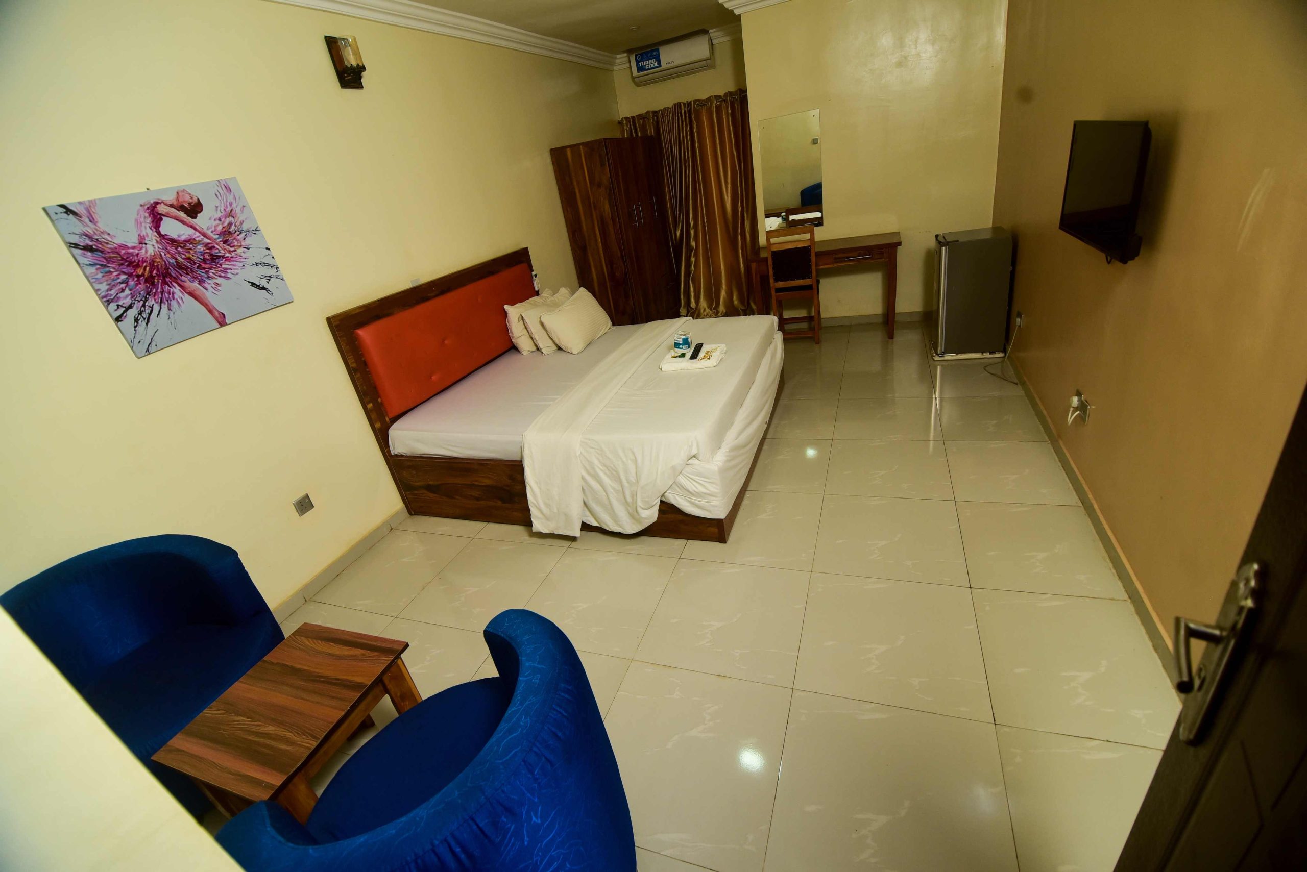 Our Superior Standard room is the smallest budget room with a shower. The furniture includes a desk, two chairs, a center table, bedside tables, and a wardrobe/closet. The amenities include a television, air conditioning, Wi-Fi access, a telephone, and a mini fridge.